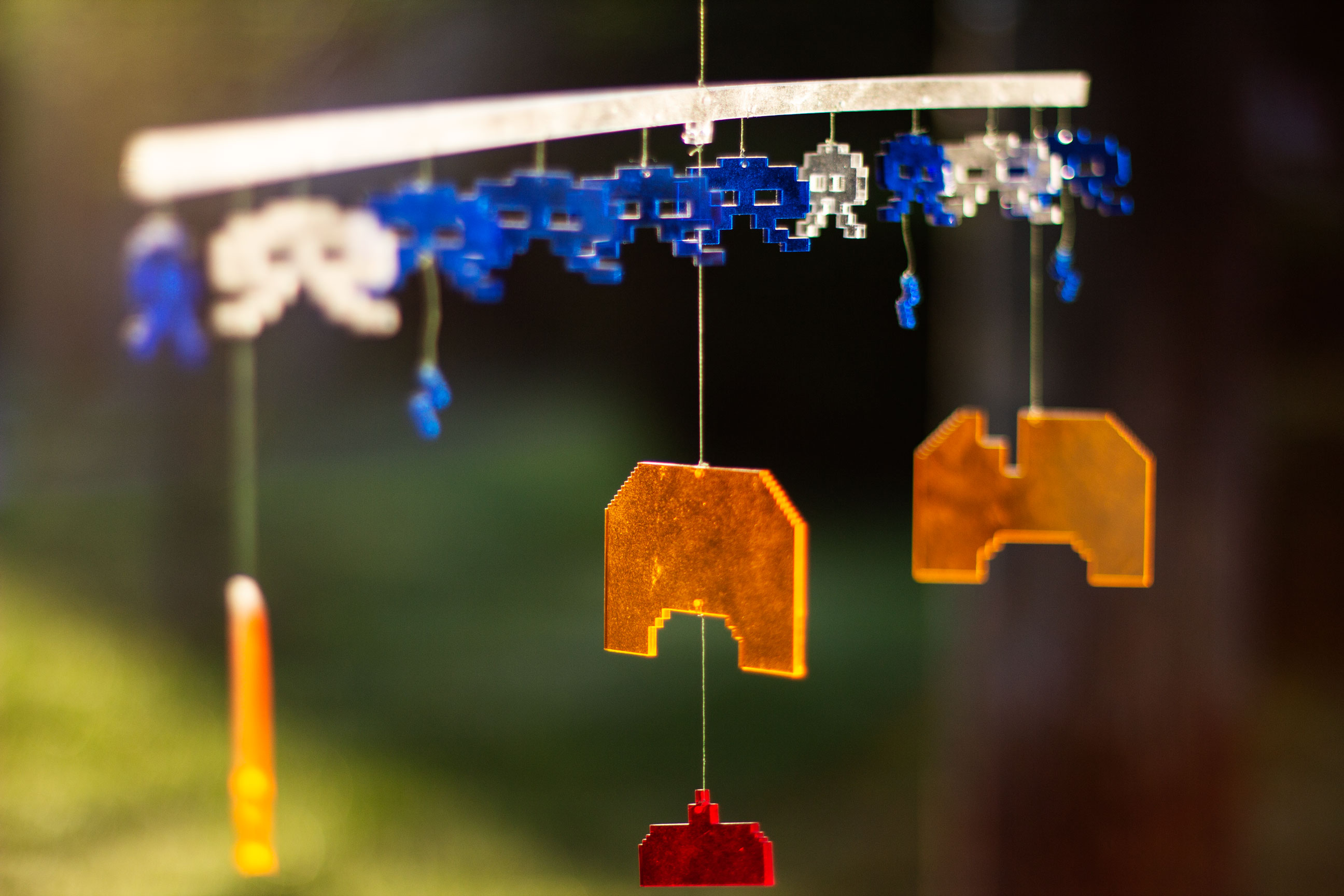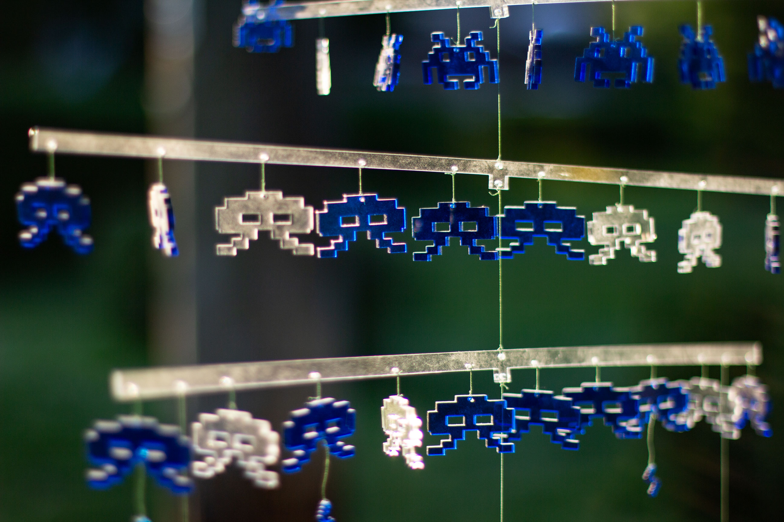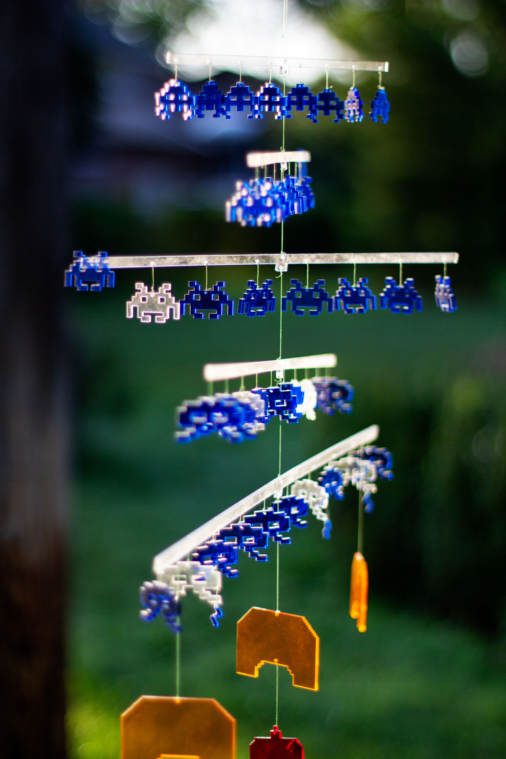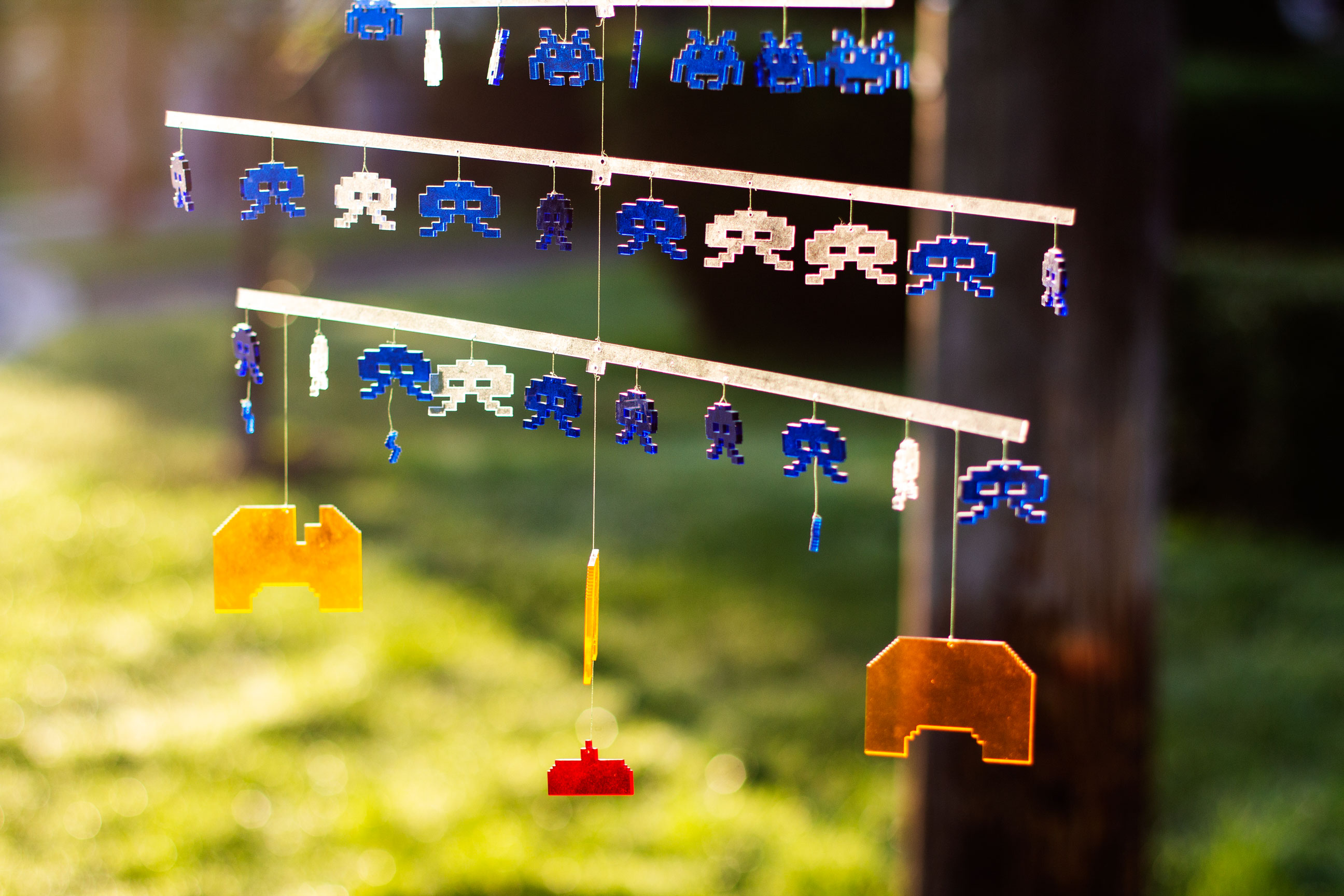 This was a personal project. I wanted to create a hanging mobile based on the Space Invaders video game. The pieces were laser cut from acrylic.